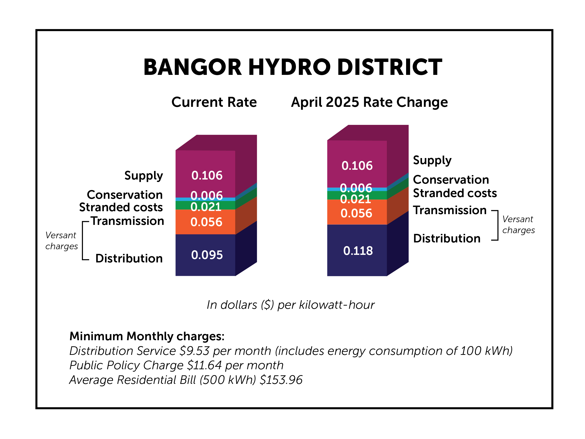 Versant Power seeks permission from the Maine Public Utilities Commission or the Federal Regulatory Commission for any change to transmission or distribution rates, which represent the cost to bring electricity from where it is made to your home or business. The utility is responsible for delivery of electricity, and does not control or benefit from changes in supply prices. If you are experiencing financial hardship and have trouble paying your electricity bill, please call us to learn about potential resources. Local Community Action Programs offer applications for assistance programs including the Home Energy Assistance Program, the Low-Income Assistance Program and the Arrearage Management Program, and have partnered with Versant Power for the Power Match program offering electricity assistance to those who might not otherwise qualify for assistance. Customers also may benefit from information and programs offered by Efficiency Maine. To learn more, visit versantpower.com, call our Customer Contact Center at 1-855-363-7211 or 207-973-2000, or email info@versantpower.com. You can also follow us on Twitter (@versantpower), Instagram (versantpower) or LinkedIn. Versant Power is committed to delivering safe, reliable electric service. As the state's second-largest electric utility, the company delivers electricity to more than 164,000 residential, commercial and industrial customers across 10,400 square miles in five counties in eastern and northern Maine.